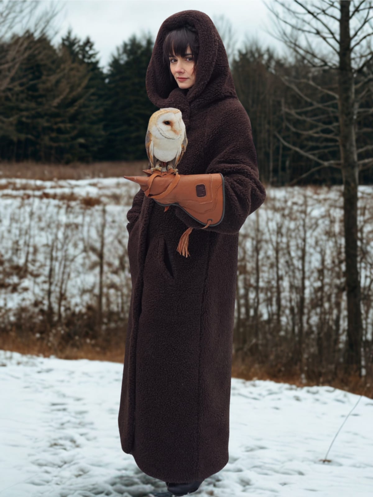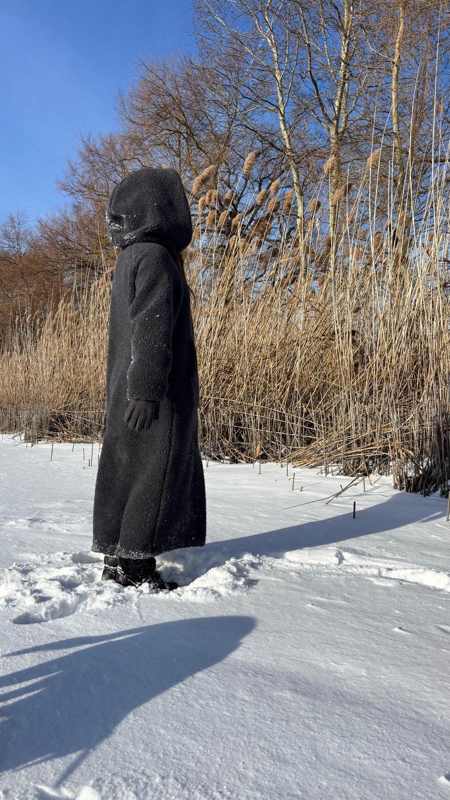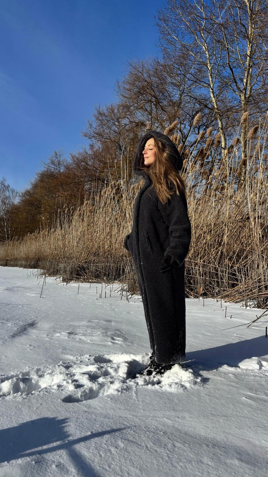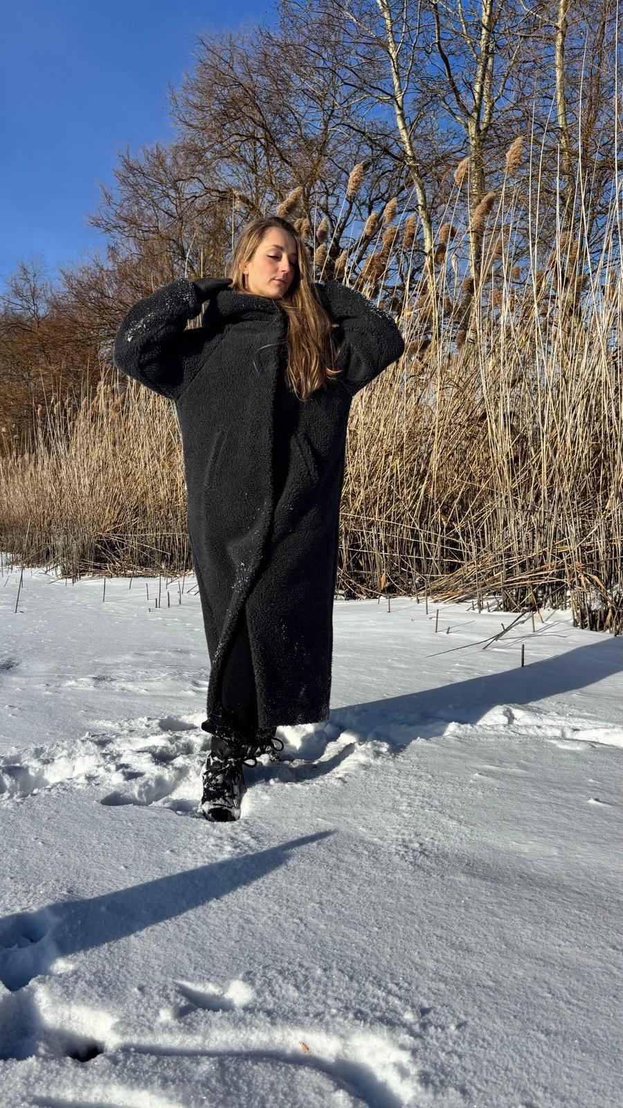 To płaszcz, który otula ciało jak miękki, ciepły koc — daje uczucie, jakbyś nie wyszła z łóżka, ale w bardzo eleganckiej wersji. Długość za kolano wydłuża sylwetkę, a kaptur dodaje funkcjonalności i dodatkowego otulenia w chłodniejsze dni.