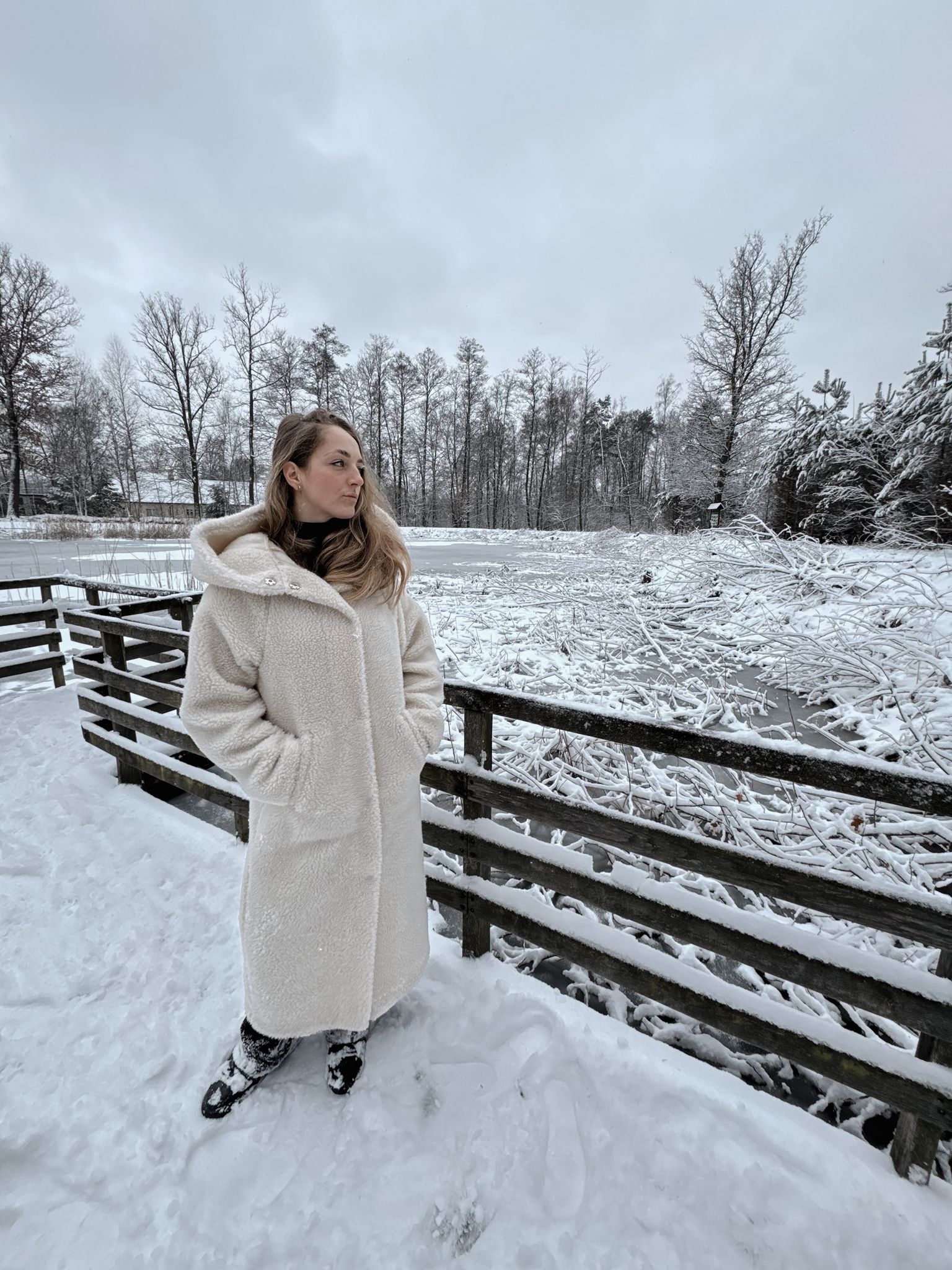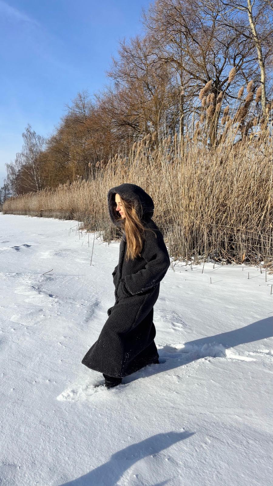 Długi płaszcz z luksusowej wełny merino w runie, lekki i miękki jak ulubiony kocyk. Model Teddy posiada kaptur, jednorzędowy fason oraz zapinanie na sześć metalowych zatrzasków. Długość za kolano zapewnia elegancką linię i świetną ochronę przed chłodem.